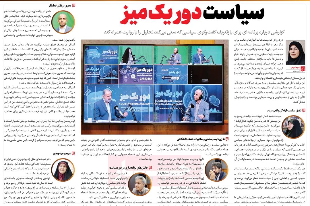 «دور یك میز»؛ به تهیه كنندگی سیده فاطمه شعار و فریدون ماهر سردبیری دكترعلیرضا داودی و اجرای كارشناسی محمدرضا اشراقی، مهدی معظمی و پژمان كریمی یك میزگرد تخصصی سیاسی محور است كه روزهای شنبه تا چهارشنبه ساعت 12:30 تا 14:00 بر روی آنتن رادیو تهران میرود.